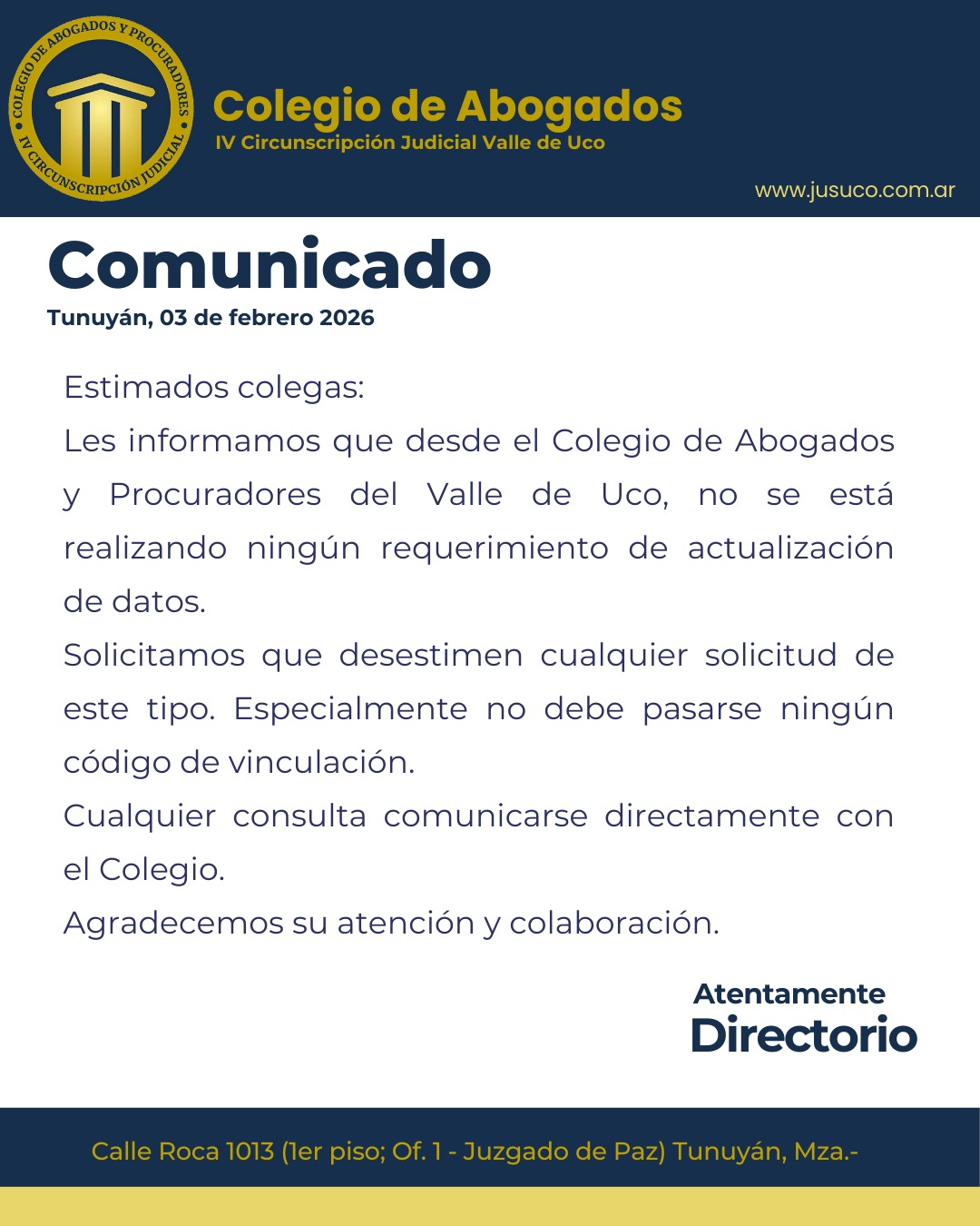 El Colegio de Abogados de la Cuarta Circunscripción informa la conformación de la Comisión de Derecho Penal en el Valle de Uco. La misma tiene como finalidad impulsar la capacitación continua de los profesionales y constituirse en una voz activa para visibilizar las falencias del sistema penal en el Valle de Uco, promoviendo el debate y la búsqueda de soluciones.