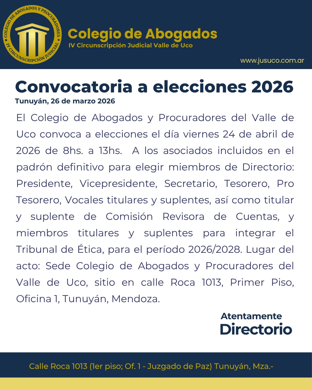 El Colegio de Abogados y Procuradores del Valle de Uco convoca a la elección de Directorio y Tribunal de Ética de la IV Circunscripción Judicial del Valle de Uco.